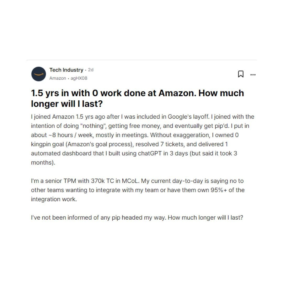 “I joined Amazon 1.5 years ago after being included in Google’s layoff. I joined with the intention of doing 'nothing,' getting free money, and eventually being placed on a Performance Improvement Plan (PIP),” his post read on Blind.