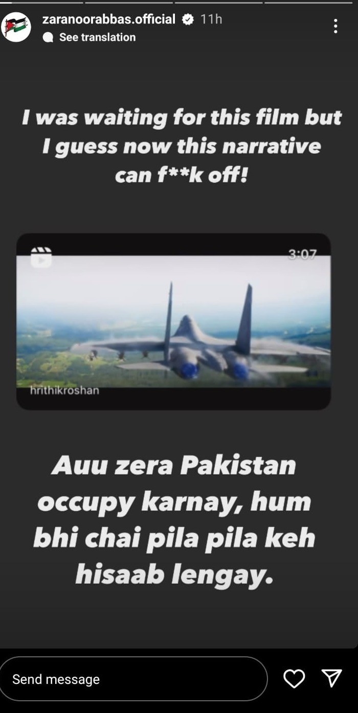 Zara Noor Abbas vehemently criticised the production of such films on her Instagram story. She highlighted the illogical nature of portraying scenarios “where neither Pakistan nor India can occupy each other,” emphasising “Kashmir's right to an independent state.” She remarked that “while one can foster love through art, the influence of Narendra Modi prevents Bollywood from doing so.”