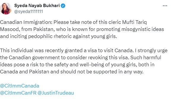 X user Syeda Nayab Bukhari condemned the cleric’s statements, calling for the revocation of his Canadian citizenship, citing that he promotes "harmful ideas which pose a risk to the safety and well-being of young girls."