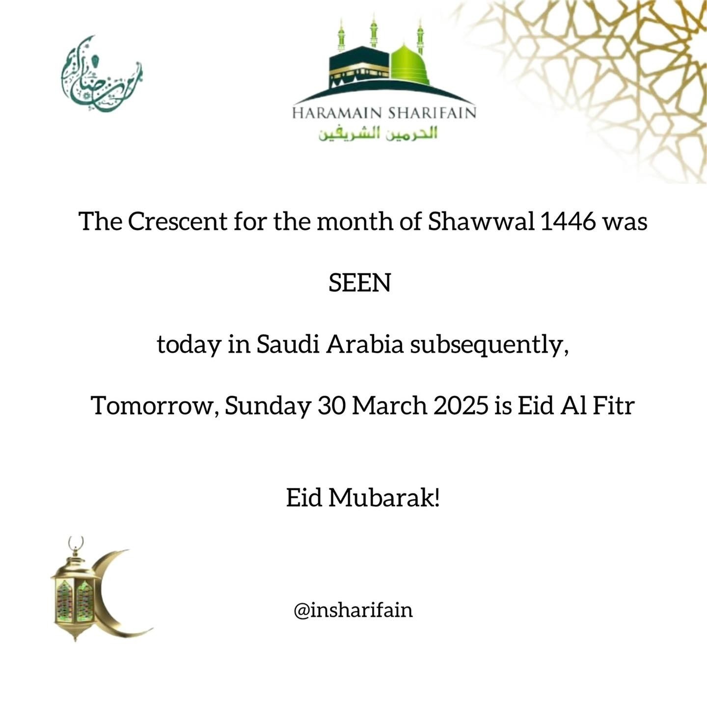 Saudi Arabia has announced that Sunday, March 30, 2025, will be the first day of Eidul Fitr, after the Shawwal crescent moon was sighted on Saturday evening.
