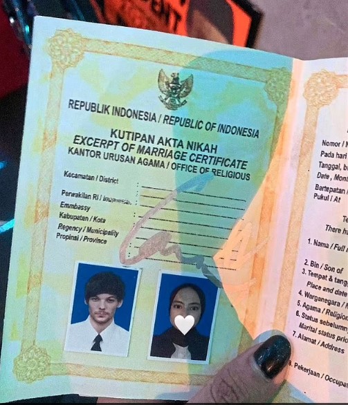 However, singer Louis Tomlinson's signed "marriage certificate" holds no legal weight in Indonesia, as marriages require official ceremonies, as explained by the US Embassy & Consulates in Indonesia.