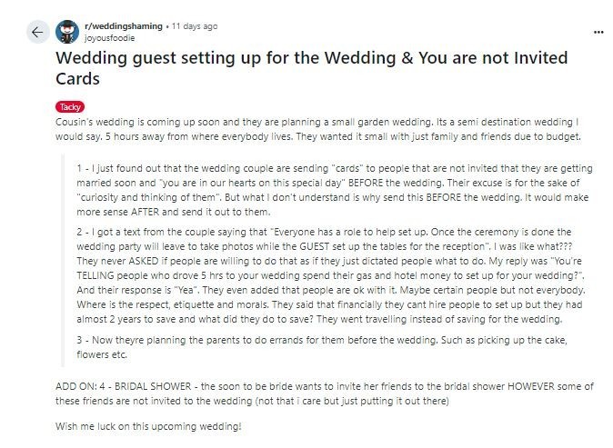 The user also mentioned feeling frustrated about attending the wedding, as the couple has asked guests to take on the responsibility of setting up tables for the reception. The couple has assigned tasks to their parents to help with wedding chores.