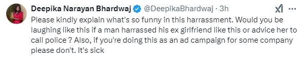 “Please kindly explain what's so funny in this harrassment. Would you be laughing like this if a man harrassed his ex girlfriend like this or advice her to call police ? Also, if you're doing this as an ad campaign for some company please don't. It's sick.” X user Deepika said.