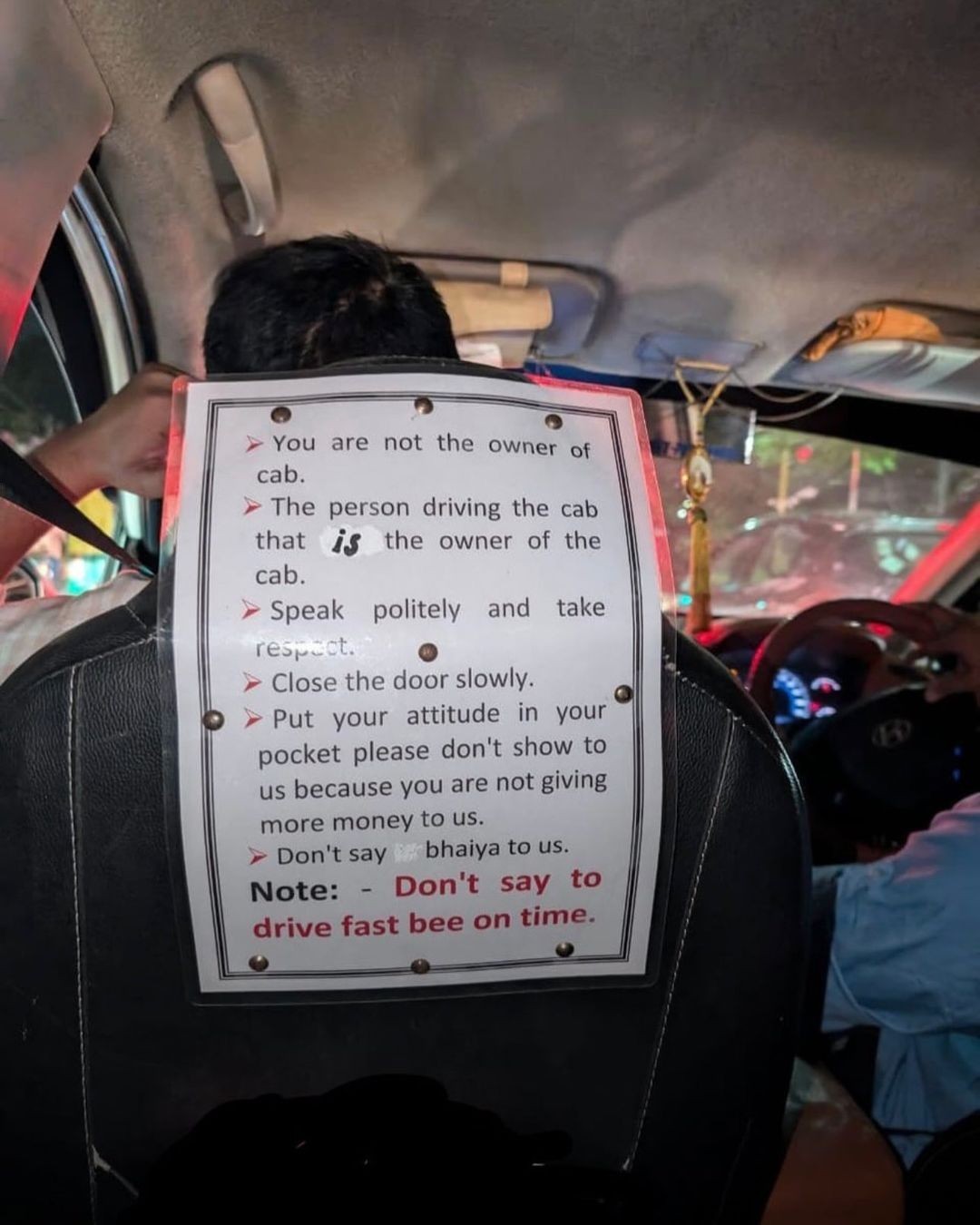 The driver pasted the page containing rules on the back of the seat for all to see.