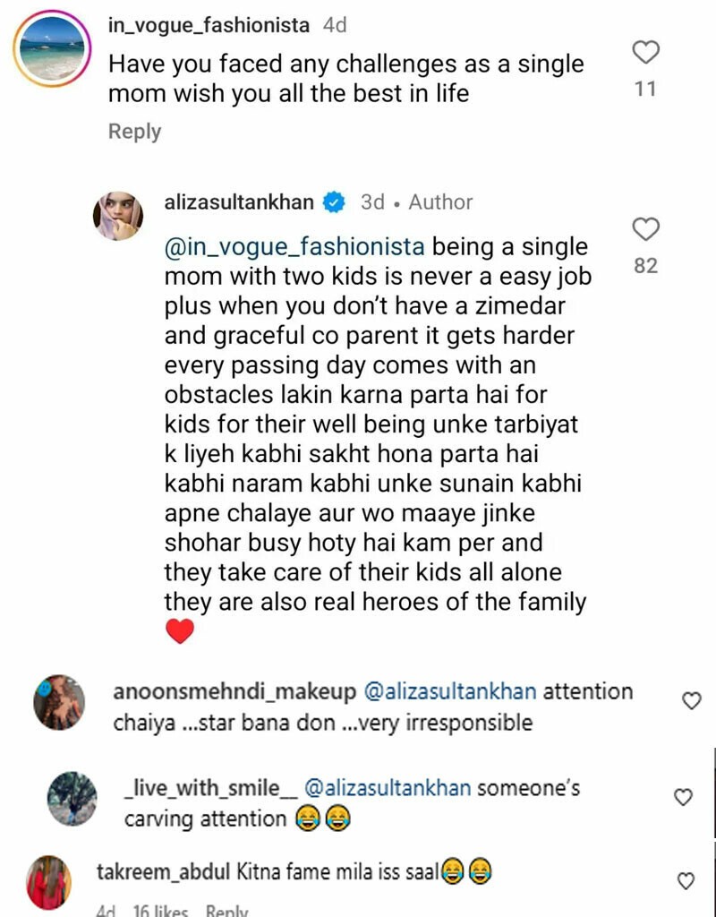 Aliza responded candidly, admitting that while being a single parent is inherently tough, it becomes even more difficult “when you don’t have a zimedar (responsible) and graceful co-parent.”