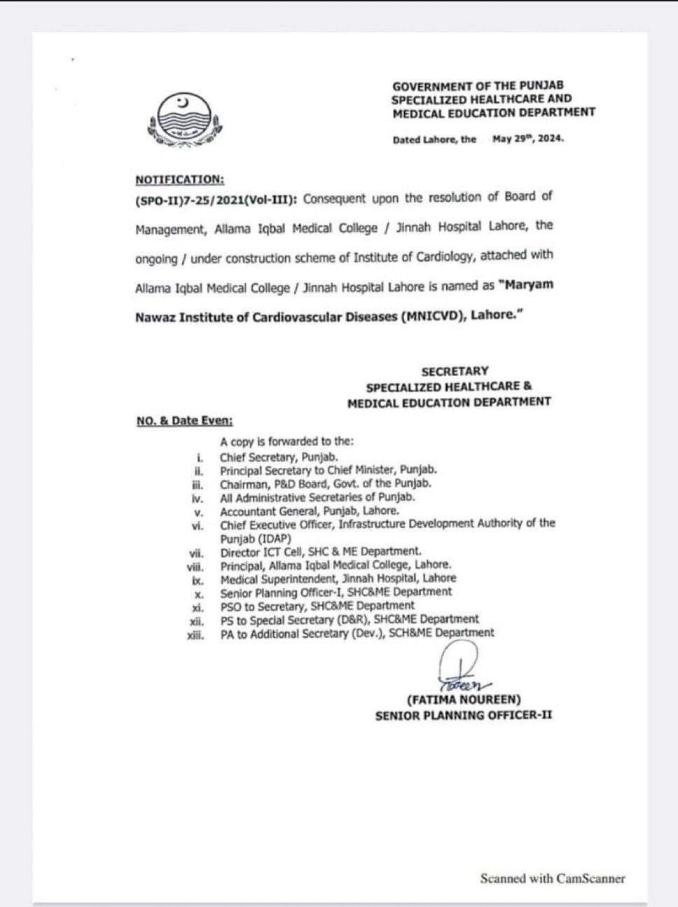 "[...] Allama Iqbal Medical College Lahore/ Jinnah Hospital Lahore, the ongoing/under-construction scheme of Institute of Cardialogy, attacked with Allama Iqbal Medical College Lahore/ Jinnah Hospital Lahore is named as Maryam Nawaz Institute of Cardiovascular Diseases (MNICVD), Lahore," the text of notification read.