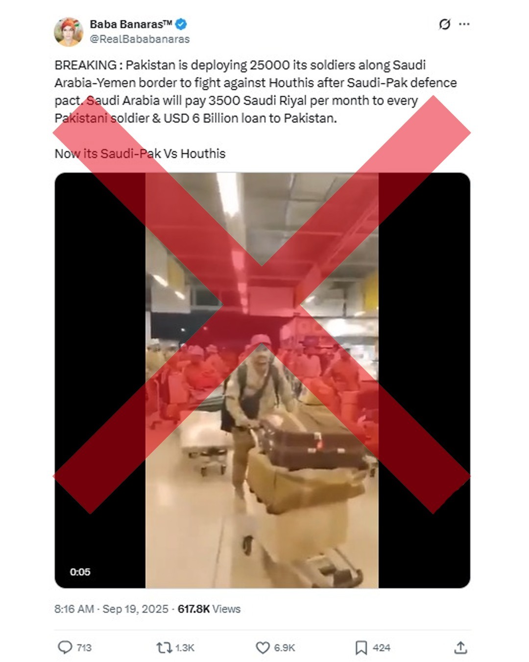 “BREAKING: Pakistan is deploying 25,000 soldiers along the Saudi Arabia–Yemen border to fight against Houthis after the Saudi-Pak defence pact. Saudi Arabia will pay 3,500 Riyals per month to each Pakistani soldier and give Pakistan a USD 6 billion loan. Now it’s Saudi-Pak Vs Houthis.”