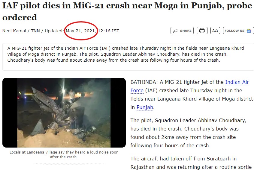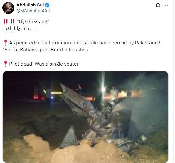 A video purportedly showing a Rafale fighter jet being shot down in Pakistan by a Chinese-made PL-15 missile is also misleading. The footage actually shows a IAF MiG-21 fighter jet near Langeana Khurd village of Moga district in Punjab that crashed in May 2021.