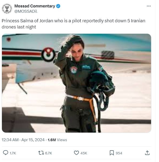 The viral post sharing a picture of Princess Salma in Air Force uniform said she shot down Iranian drones last night. It was liked and retweeted by thousands of times while the post garnered over 1.5 million views.