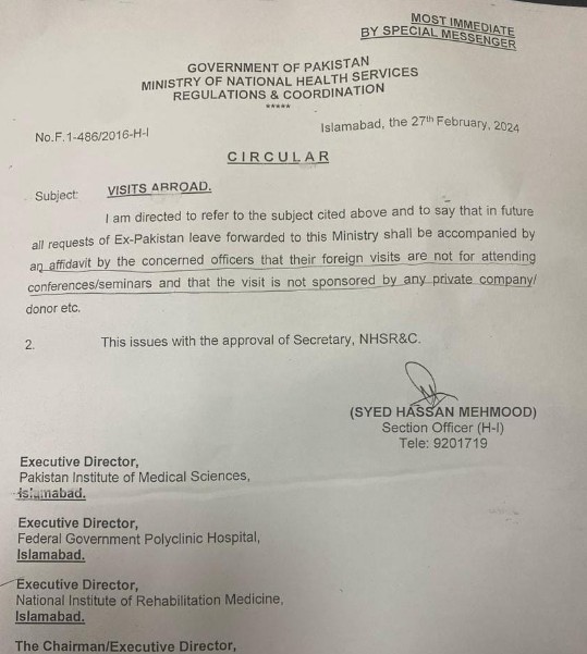 The Ministry of National Health Services has barred doctors from attending conferences and seminars in foreign countries sponsored by pharmaceutical companies.