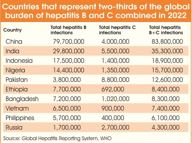 The numbers of hepatitis B and hepatitis C cases showed China, India, Indonesia, and Nigeria ahead of Pakistan.
