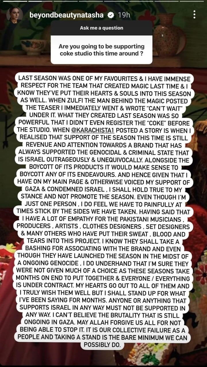 Initially excited about the season, Natasha took to her Instagram story to share her realisation that Coke Studio, being a product of the boycotted brand Coca-Cola, should also be included in the boycott campaign.