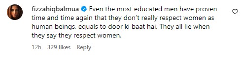 An Instagram user noted, “Even the most educated men have proven time and time again that they don’t really respect women as human beings, equals to door ki baat hai [let alone as equals]. They all lie when they say they respect women.”