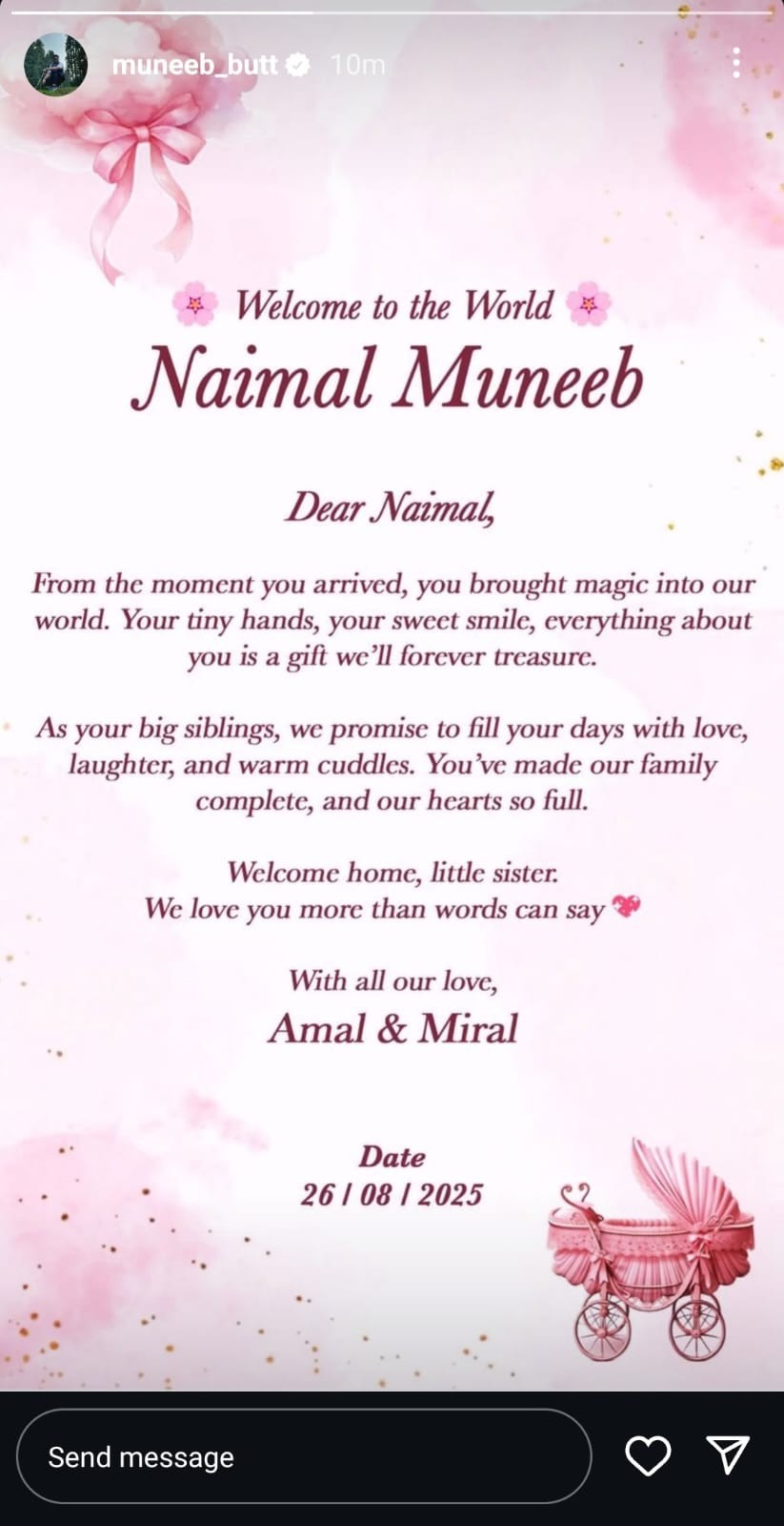 In his announcement post, Muneeb expressed immense happiness and gratitude, revealing that the couple has named their daughter Naimal Muneeb.