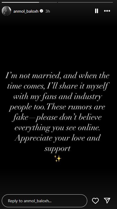 Taking to her Instagram story, Anmol clarified the speculation about her supposed marriage, urging her followers not to believe in fake news.