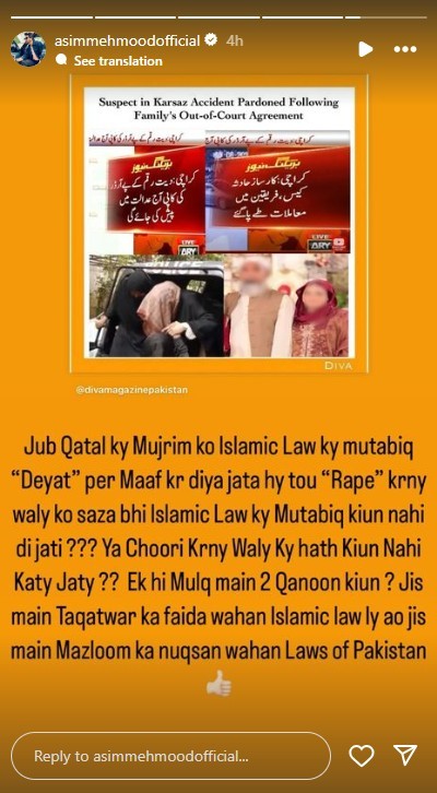 Renowned actor Asim Mehmood shared his views on the settlement between the parties involved in the Karsaz accident case, questioning the double standards in applying Islamic law within the country according to convenience.