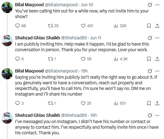 Bilal countered, “Saying you’re inviting him publicly isn’t really the right way to go about it. If you genuinely want to have a conversation, reach out properly and respectfully, you’ll have to call him. I’m sure he won’t say no. DM me on Instagram and I’ll share his number.”