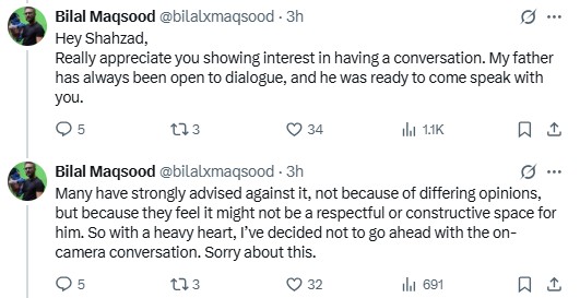 Following this exchange, Bilal shared that his father, along with close family and friends, had advised against appearing on Shehzad’s show, expressing concern that it might not be a 'respectful or constructive space' for such a dialogue.