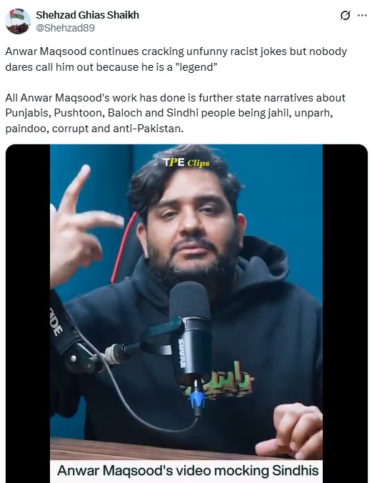 “Anwar Maqsood continues cracking unfunny racist jokes but nobody dares call him out because he is a 'legend',” Shehzad wrote in a post on X.