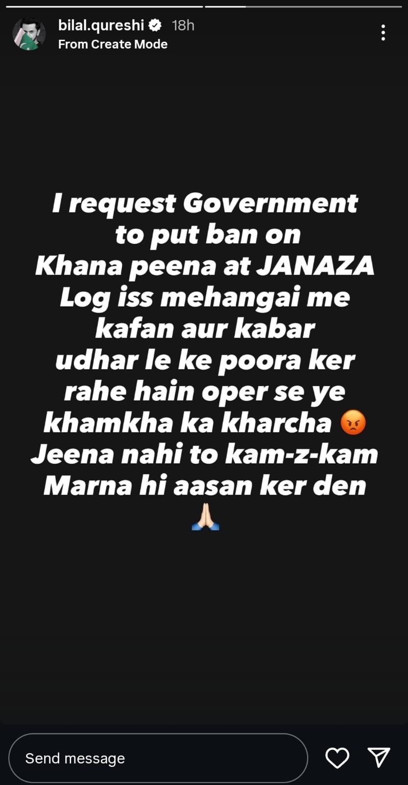 “I request the government to ban food at funerals. Families are already burdened with expenses related to coffins, burial, and other arrangements. Please make death easier, life itself has become expensive and difficult enough,” Qureshi wrote.