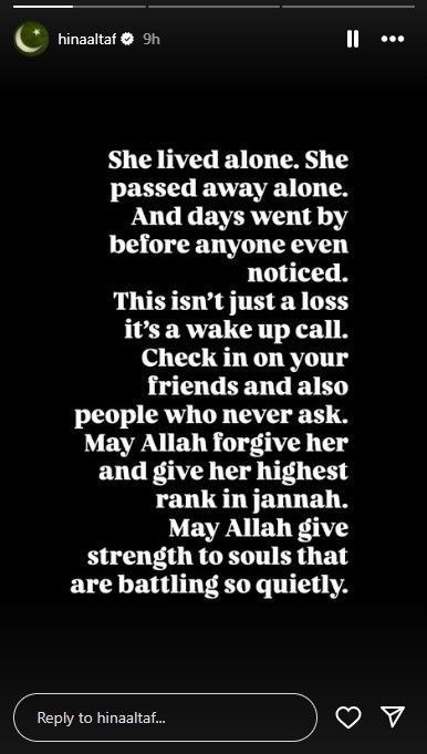 “She lived alone, she passed away alone. And days went by before anyone even noticed,” Hina wrote in her Instagram story.
