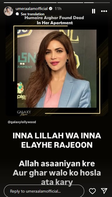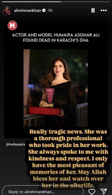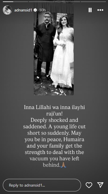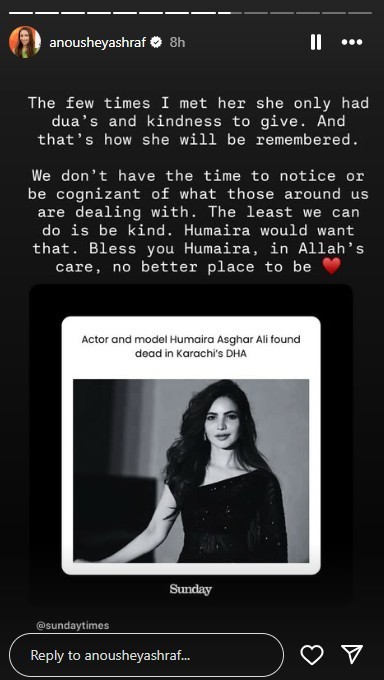 Actor Adnan Siddiqui and reality show contestant Umer Aalam, who worked with Humaira in Tamasha, also expressed their grief. Fellow artists Anoushey Ashraf, Ali Rehman, and Ayaz Samoo took to social media to mourn her passing and raise awareness about emotional well-being.
