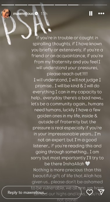 “This isn’t just a loss, it’s a reminder. Check in on your friends, even those who never ask,” she added, offering prayers for the departed soul and strength to those silently struggling with life.
