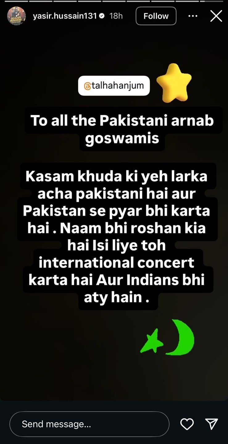 “To all the Arnab Goswamis… This man loves Pakistan and he has made his country proud. That’s why he gets invited to international concerts, and Indians come to his shows,” he wrote.