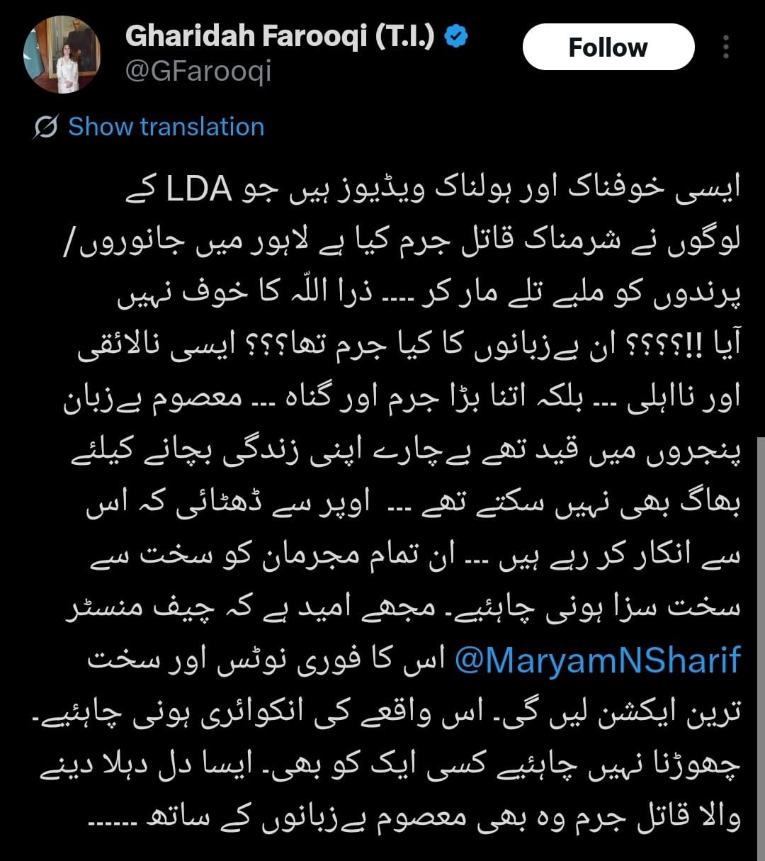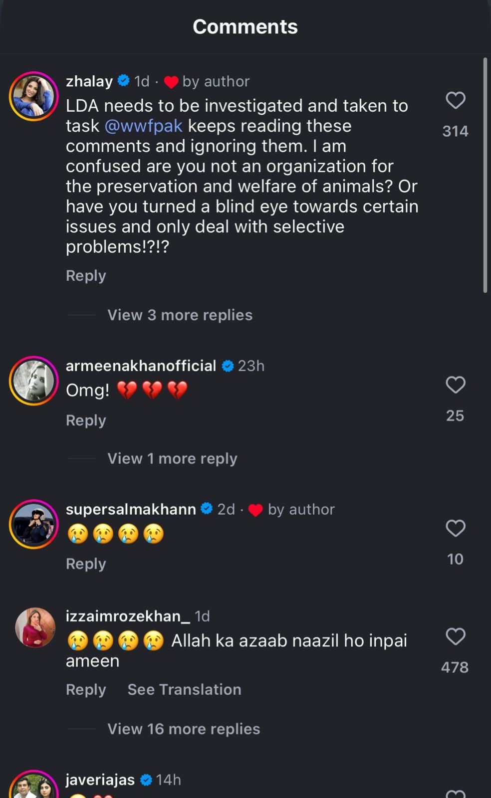 Zhalay also condemned the act, stating, “LDA needs to be investigated and taken to task.” She went on to question WWF-Pakistan’s silence, saying, “They keep on reading comments and ignoring them. I am confused, are you not an organization for the preservation and welfare of animals? Or have you turned blind towards certain issues and only deal with selective problems?”