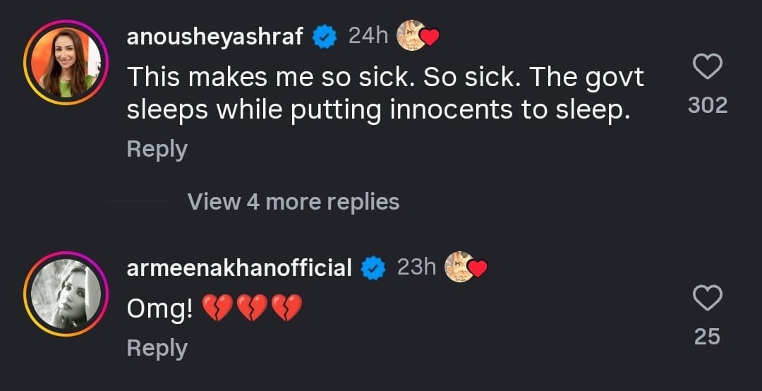 Similarly, Anoushey Ashraf commented, “This makes me sick. So sick. The govt sleeps while putting innocents to sleep.”