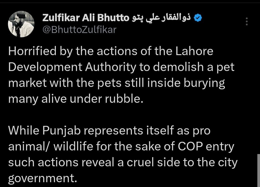 Meanwhile, socialist Zulfiqar Ali Bhutto added, “Horrified by the actions of the Lahore Development Authority to demolish a pet market with the pets still inside burying many alive under rubble. While Punjab represents itself as pro animal/ wildlife for the sake of COP entry such actions reveal a cruel side to the city government.”