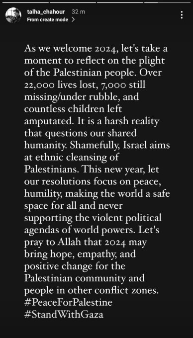 The ‘Mannat Murad’ actor Talha Chahour urged everyone to prioritize resolutions that foster peace and humility in the world for the new year. He took to his Instagram story and shared, “As we welcome 2024, let’s take a moment to reflect on the plight of Palestinian people. Over 22,000 lives lost, 7,000 still missing/under rubble and countless children left amputated. It is a harsh reality that questions out shared humanity. Shamedully Israel aims at ethnic cleansing of PAlestinians. This new year, let our resolutions focus on peace, humility, making the world a safe space for all and never supporting the violent politican agendas of political powers. Let’s par to Allah that 2024 bring hope, empathy for the Palestinian community and people in other conflict zones. #PeaceForPalestine #StandWithGaza.”