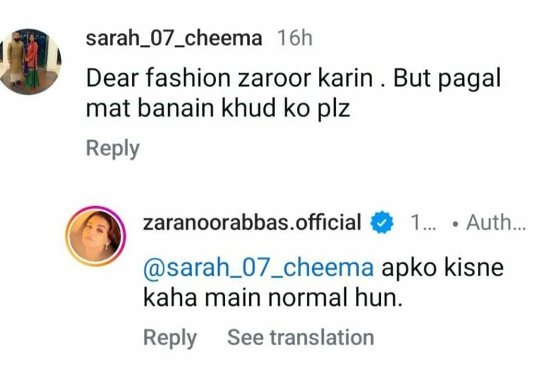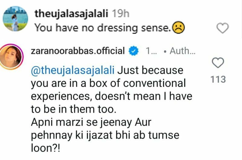 Pakistani actress Zara Noor Abbas has fired back at social media users who criticised her recent outfit, a simple pants and shirt combination, on Instagram.