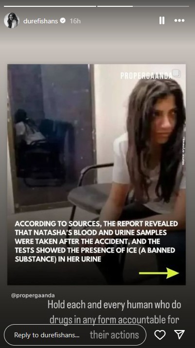 Durefishan demands accountability of Natasha for causing deadly accident under drug influence