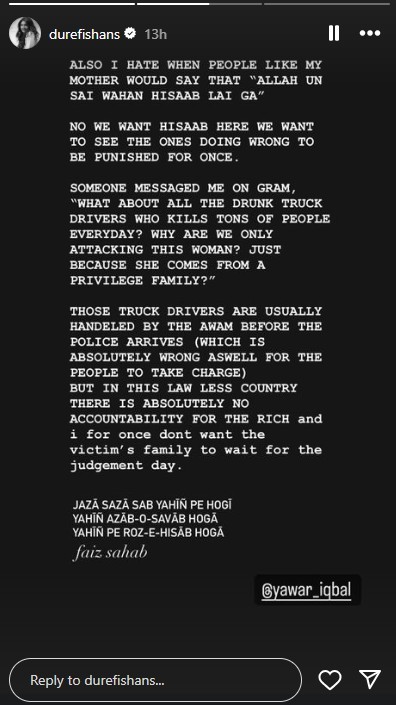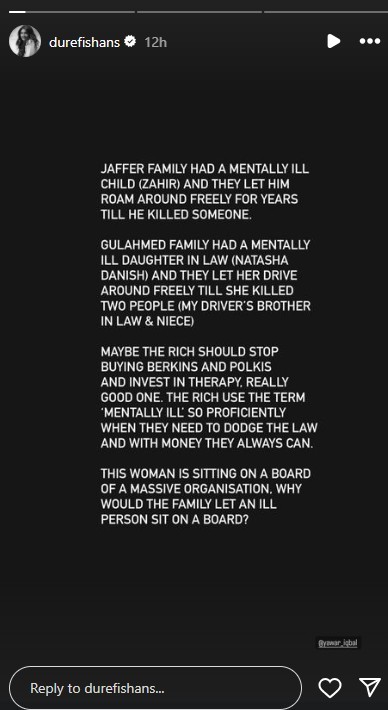 “ [...] the Gul Ahmed family had a mentally ill daughter (Natasha Danish) and they let her drive around freely till she killed two people, my driver’s brother-in-law and his niece,” Durefishan quoted her friend Yawar Iqbal as saying.