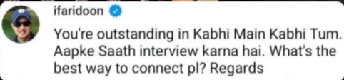 Moving on in the latest round of events, the Indian Journalist Faridoon, known for his insightful coverage of the entertainment industry, has taken to his Instagram handle and dropped a message for Hania Aamir in which he admired her performance in the drama serial 'Kabhi Mein Kabhi Tum' and asked for the interview.