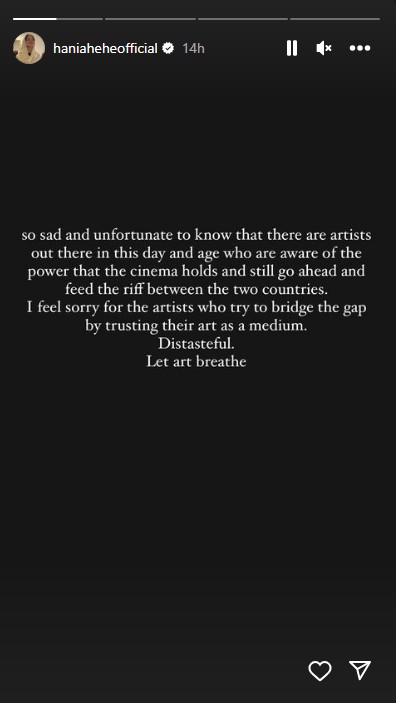 Talking to her Instagram story, she observed, “So sad and unfortunate to know that there are artists out there in this day and age who are aware of the power that the cinema holds and still go ahead and feed the riff between the two countries. I feel sorry for the artists who try to bridge the gap by trusting their art as a medium. Distasteful. Let art breathe.”