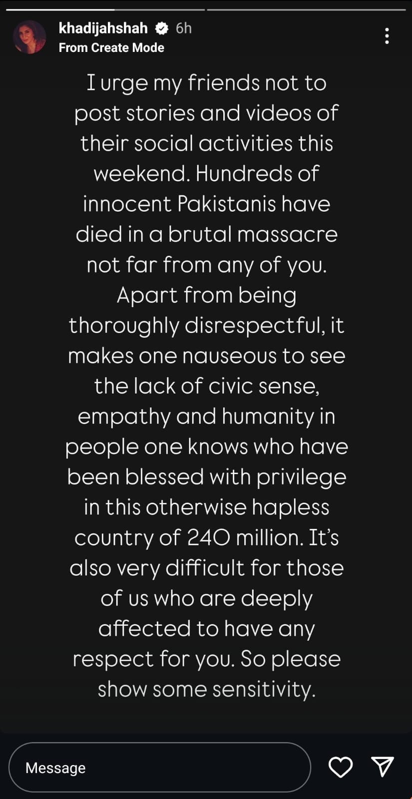 Taking to Instagram, Shah stated, “I urge my friends not to post stories and videos of their social activities this weekend. Hundreds of innocent Pakistanis have died in a brutal massacre not far from any of you.”