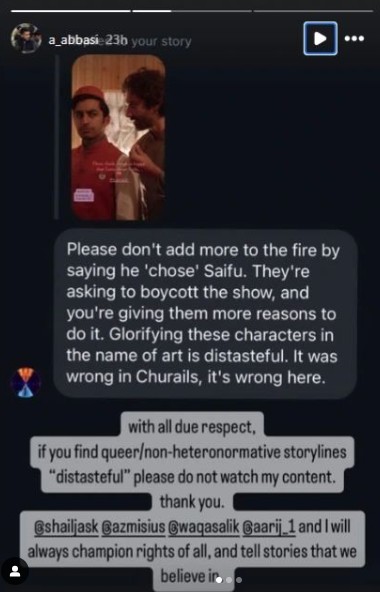 Taking to Instagram, Abbasi shared a screenshot of a message from a fan criticising him for promoting homosexuality in his projects, first in Churails and now in Barzakh.