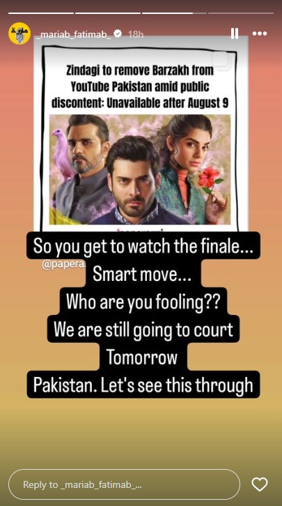 Maria B took to her Instagram story to react to Barzakh's removal from YouTube. She criticised that the decision to stream the final episode beforehand was a “smart move” by the show's creators.