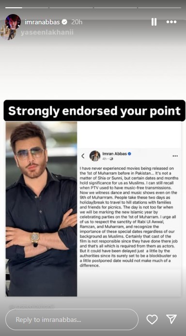 While many Pakistani celebrities publicly supported the film and encouraged people to watch it in cinemas, Imran Abbas stood apart, voicing strong disapproval of its release date.