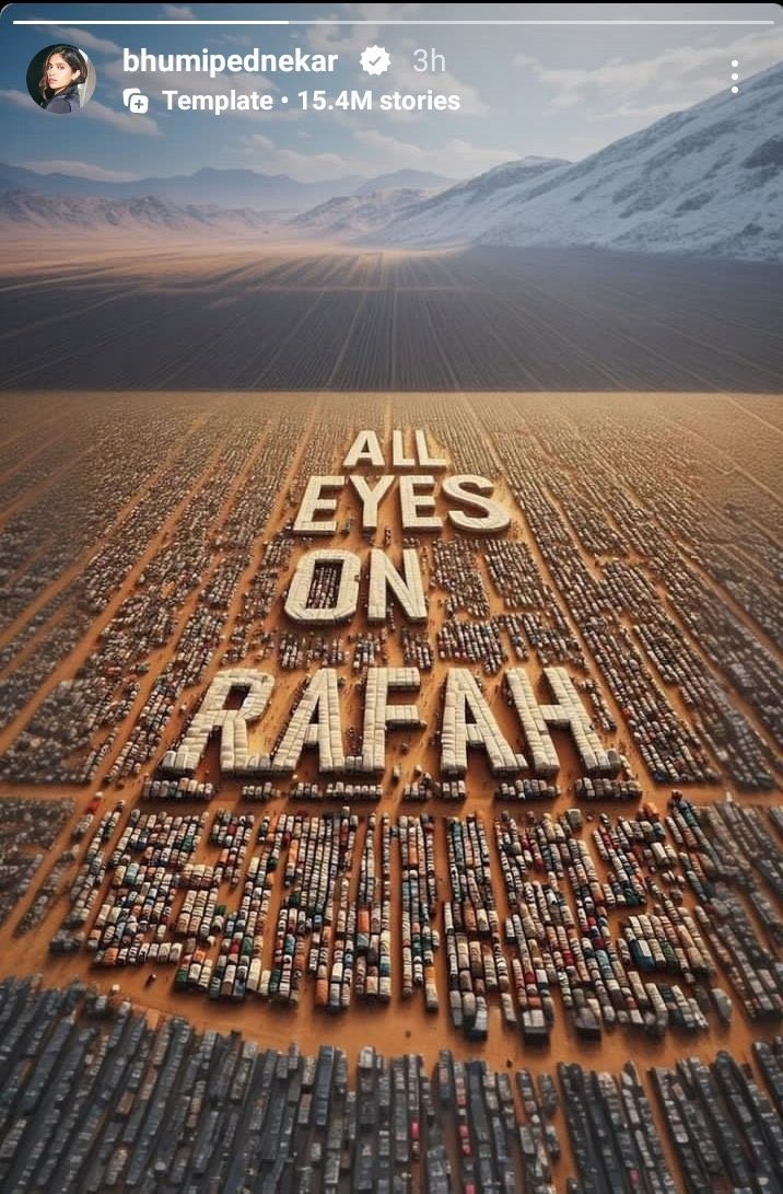Indian celebrities, including actors, actresses, singers, fashion designers, models, and athletes, have shared the template on their social media accounts, urging their followers to join the campaign and stand in solidarity with the people of Palestine.