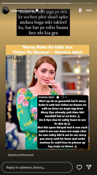 Taking to Instagram, Momina Iqbal requested her followers to respect her privacy and refrain from creating and tagging her in video edits of her with her late father.