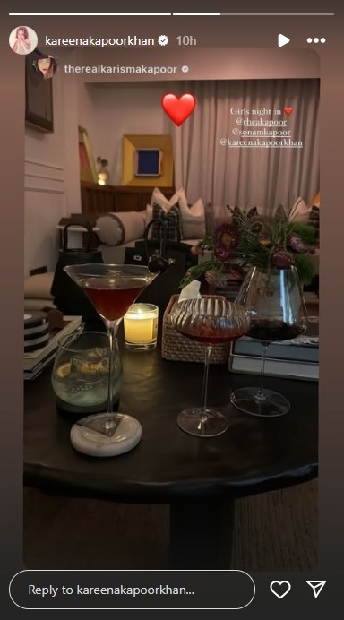 She had reposted Karisma Kapoor’s Instagram story, which featured three wine glasses placed on a table, accompanied by the caption, "Girls night in."