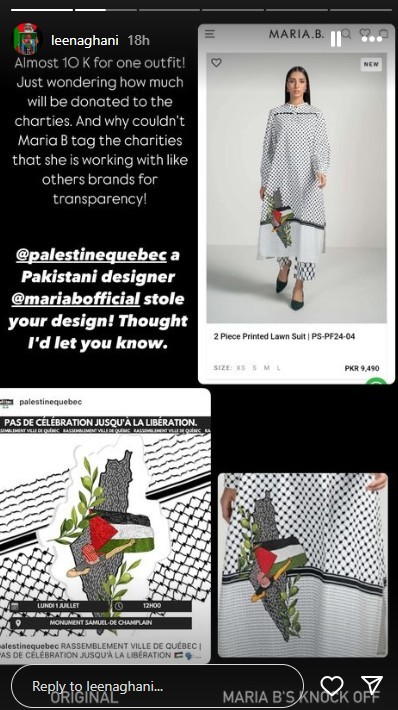 Activist Leena Ghani took to Instagram to reveal that Maria B appropriated the design of an artist. The original artwork was spotted on a Canadian page dedicated to solidarity with Palestinians.