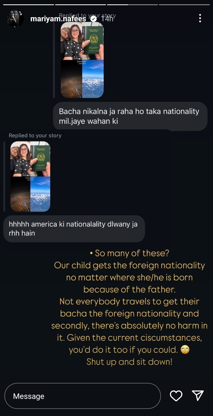 Renowned actor Mariyam Nafees responded firmly to trolls who slid into her DMs, claiming that she was traveling to the UK ahead of her delivery to secure foreign citizenship for her baby.