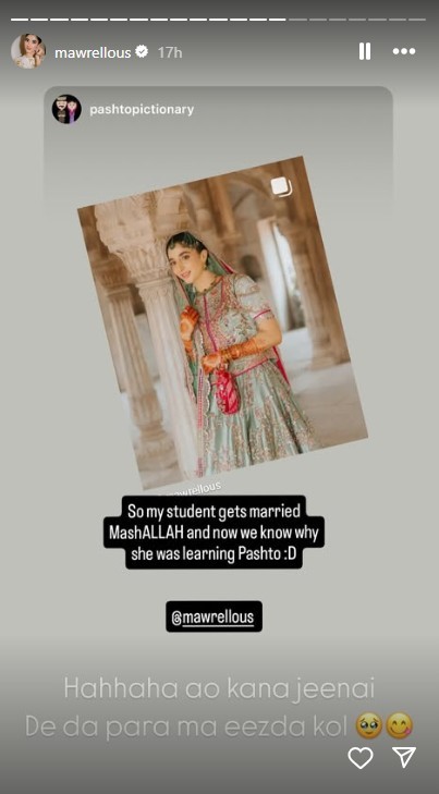 Recently, Mawra reposted an Instagram story from her teacher, who congratulated her on her wedding and finally discovered the reason behind her interest in learning Pashto.