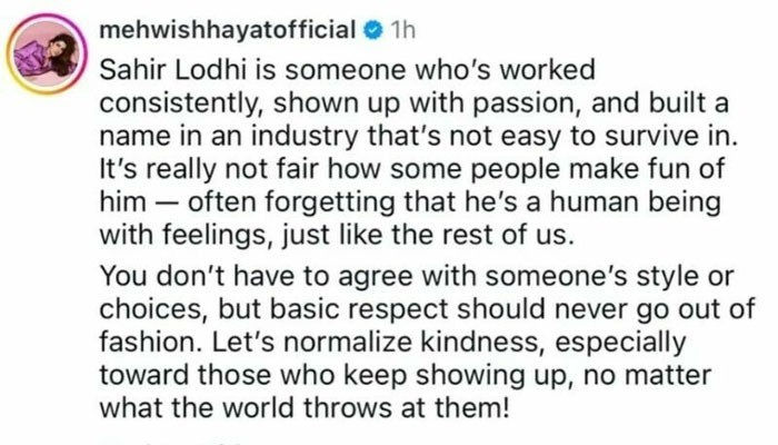 As several celebrtiies tried to take a dig at Sahir's videos, actress Mehwish Hayat took to Instagram to voice her disapproval, emphasising the importance of maintaining dignity and respect within the entertainment industry.