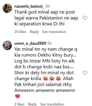 One user wrote, “Through this video, she removed all our doubts.” Another fan gushed, “Minal rocked, haters shocked.” A witty follower added, “Thank God you posted this, otherwise Pakistanis would have declared your separation themselves.”