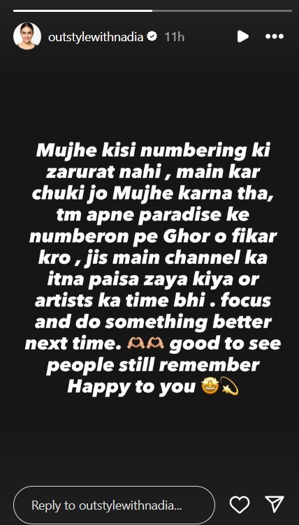 Taking to Instagram, Nadia addressed the matter and dismissed the relevance of ratings in her life. Instead, she called out Yasir for his recent directorial project Paradise, criticising the show's quality.